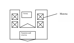 Рис.4. Здание цеха ш-образной формы с молотами в разных крыльях и термическим участком.