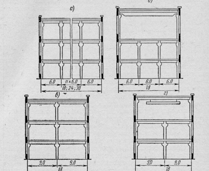 Рис.15. Поперечный разрез трехэтажных производственных зданий, скомпонованных из унифицированных секций.