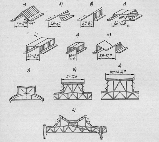 а – треугольная; б, в – зубчатые (пилообразные); г – трапецеидальная с наклонным остеклением; д, е, и – прямоугольные с вертикальным остеклением; ж, к, л – М-образные с вертикальным остеклением; з – М-образная с вертикальным остеклением при железобетонной конструкции.