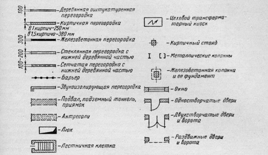 Из-за большого количества строительных элементов, изображаемых на планах производственных зданий, целесообразно придать им определенные условные обозначения. Рис. 19.