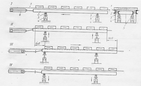 Рис.25. Схема шагающего конвейера: 1 – заготовка; 3 – балка; 4-цилиндры; 5 – ролики; 6 – цилиндр.