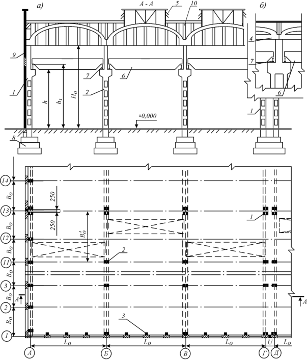 Обозначения: 1 – крайние колонны, 2 – средние колонны, 3 – колонны вехверковые, 4 – ферма, 5 –подстропильная ферма, 6 – кран, 7 – подкрановые пути, 8 – фундамент колонны, 9 – стена, 10 - светоаэрационные фонари.