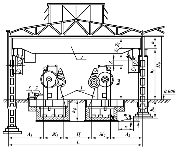 Все пролеты здания в цехах рекомендуется выполнять одной высоты, которая назначается по высоте, требуемой для установки наиболее высокого оборудования. При дипломном проектировании необходимо показать разрез цеха в месте установки самого высокого оборудования (рис.3) [1].