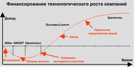 Вот некоторые из них. Так как для прибыльной реализации инвестиций, вложенных в венчурные предприятия, необходим выход новой высокотехнологичной компании на фондовый рынок для продажи акций, владелец вложенных в компанию средств интересуется не дивидендами, а приростом самого капитала. Обычно венчурные капиталисты, вкладывая средства в венчурные предприятия, хотят увеличить свой капитал не менее чем в 5 - 10 раз за 7 лет. При этом, так как венчурное предприятие впервые может выйти на фондовый рынок в лучшем случае через 3-5 лет после инвестирования, венчурный капиталист не рассчитывает на получение прибыли ранее этого срока. И весь этот период вложенный в компанию венчурный капитал неликвиден, а реальная величина прибыли становится известной только после выхода предприятия на фондовый рынок, когда инвесторы венчурного капитала получают доход за счет продажи своего пакета акций желающим за сумму, существенно превышающую объем первоначально вложенных в компанию средств.