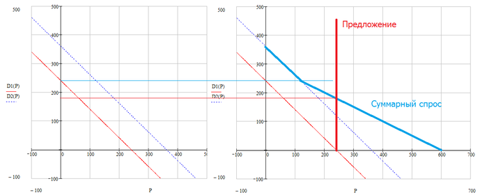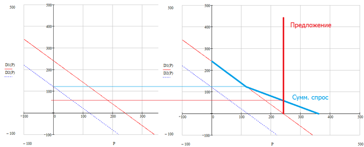 По графику видим, что в точке пересечения суммарного спроса и предложения цена будет ~ 60