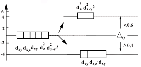 Неспаренные электроны, испытывая отталкивание от электронных пар лигандов, могут спариваться, переходя на более дальние от лигандов d-орбитали центрального атома.