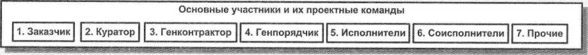 Основные участники проекта и их проектные команды — заказчик, куратор (спонсор), генеральный контрактор, субконтракторы, прочие.