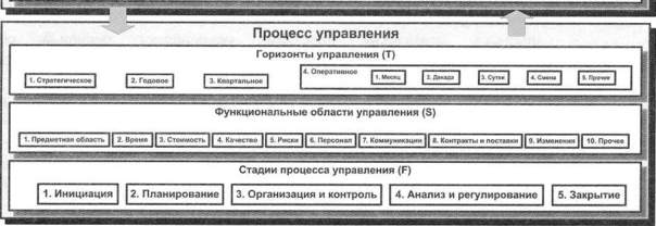 Функциональными областями управления, включающими управление предметной областью проекта, управление проектом по временным параметрам, управление стоимостью в проекте, управление качеством в проекте, управление рисками в проекте, управление персоналом в проекте, управление коммуникациями в проекте, управление контрактами в проекте, управление изменениями в проекте, прочие функциональные области.