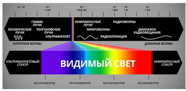 Не менее интересна классификация электромагнитных излучений относительно длины волны в нанометрах, где в качестве акцента дан диапазон видимой части спектра ЭМИ. Видимый свет это самый узкий диапазон во всем спектре. Человек воспринимает только его. Видимый свет сочетает в себе цвета радуги: красный, оранжевый, желтый, зеленый, голубой, синий, фиолетовый. За красным цветом находится инфракрасное излучение, за фиолетовым – ультрафиолетовое, но они уже не различимы человеческим глазом. Волны видимого света очень короткие и высокочастотные. Длина таких волн – одна миллиардная часть метра или один миллиард нанометров. Видимый свет от Солнца – своеобразный коктейль, в котором смешаны три основных цвета: красный, желтый и синий.