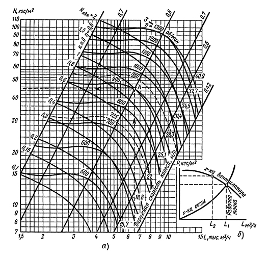По двум, только что полученным характеристикам вентиляционной установки – производительность (расход) и потери давления – отыскиваются по представленной номограмме три основных параметра вентиляционного колеса: мощность, КПД и число оборотов. После чего выбирается ближайшее готовое изделие.