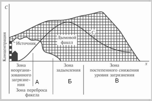 Технологические газы и вентиляционный воздух после выхода из труб или вентиляционных устройств, подчиняется законам турбулентной диффузии. На рисунке, изображенном ниже, показано распределение концентрации вредных веществ в атмосфере под факелом организованного высокого источника выброса. По мере удаления от трубы в направлении распространения промышленных выбросов можно условно выделить три зоны загрязнения атмосферы: зона переброса факела выбросов А, характеризующаяся относительно невысоким содержанием вредных веществ в приземном слое атмосферы; зона задымления Б с максимальным содержанием вредных веществ и зона постепенного снижения уровня загрязнения В. Зона задымления наиболее опасна для населения и должна быть исключена из селитебной застройки. Размеры этой зоны в зависимости от метеорологических условий находятся в пределах 10…49 высот трубы.