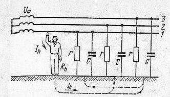 В сетях с изолированной нейтралью условия электробезопасности определяются сопротивлениями изоляции и емкостью относительно земли. Ток, проходящий через тело человека: