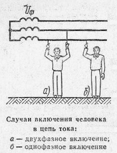 Наиболее характерными являются две схемы включения человека в электрическую сеть: