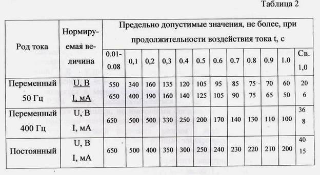 Предельно допустимые значения напряжений прикосновения и токов при аварийном режиме производственных электроустановок не должны превышать значений, указанных в таблице 2.