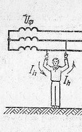 , поэтому напряжение прикосновения будет значительно большего фазного и несколько меньше линейного. Этот случай во много раз опаснее прикосновения к той же фазе сети при нормальном режиме работы, принимая во внимание, что