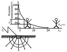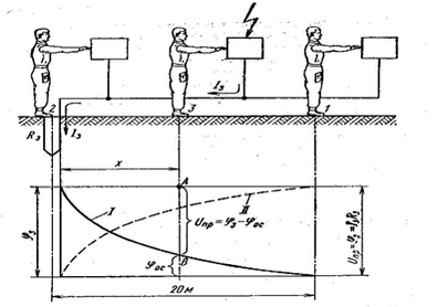 , а практическая при х=20 м (точка 1 на рисунке) напряжение прикосновения имеет наибольшее значение Uпр=φз. Это наиболее опасный случай прикосновения. При наименьшем значении х, когда человек стоит непосредственно на заземлителе, Uпр=0.