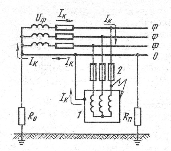 | Принципиальная схема зануления. 1 – корпус; 2 – аппараты для защиты от токов короткого замыкания (плавкие предохранители, автоматы и т.л.); Rо – сопротивление заземления нейтрали источника тока; Rп – сопротивление повторного заземления нулевого защитного провода; Iк – ток короткого замыкания. |