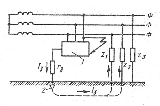 | Принципиальная схема защитного заземления в сети с изолированной нейтралью до 1000 В и выше: 1 – заземленное оборудование; 2 – заземлитель защитного заземления; rз – сопротивление защитного заземления; Iз – ток замыкания на землю. |