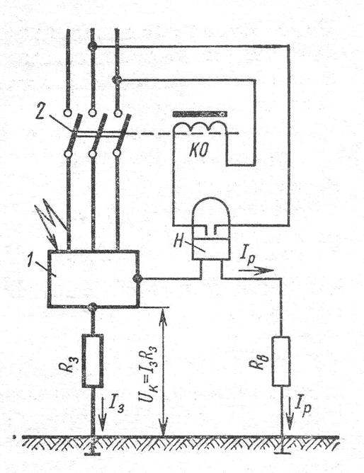 | Принципиальная схема устройства защитного отключения , реанирующего на напряжение корпуса относительно земли: 1 – корпус; 2 – автоматический выключатель; КО – катушка отключения; Н – реле напряжения максимальное; Rз – сопротивление защитного заземления; Rв – сопротивление вспомогательного заземления. |