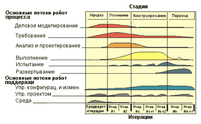 Это лишь немногое из того, что детально описано в RUP и рекомендовано для структурирования производства ПО. На рисунке показана переведенная схема RUP по стадиям работы над проектом. Высота потока показывает на его интенсивность. Внимательно присмотритесь к данной диаграмме, по мнению многих аналитиков (в том числе и Российских), диаграмма "жизненная" - реально отражающая потоки работ и их интенсивность. Для каждого потока работ в RUP есть продукт, выполняющий соответствующую функцию.