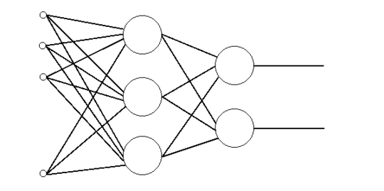 На рисунке представлен пример нейронной сети с тремя слоями, имеющей N входов, два выхода, и 3 нейрона в скрытом слое.