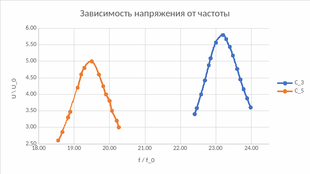 Далее измерили зависимость напряжения от частоты колебаний для двух различных емкостей: