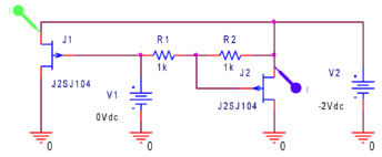 2.4,p. Составить схему моделирования компенсации нелинейности проводимости p-канального полевого транзистора (рис.1.2.p). Получить зависимости токов стока ID(J1) и ID(J2) от напряжения источника V2 в диапазоне от -2V до 0V c шагом 0.01V с параметрическим изменением напряжения V1 на затворе от 0V до 2 U0с шагом примерно равным 2 U0 (J1)/5.