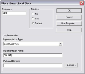 , а в появившемся окне Place Hierarchical Block в строке Reference ввести позиционное обозначение блока в схеме, в строке Implementation Type выбрать Schematic View, а в строке Implementation Name имя схемы блока и в заключение нажать OK. После чего окно Place Hierarchical Block (рис.6) автоматически закроется. Далее надо выбрать свободный участок листа основной схемы, нажать левую кнопку мыши и, не отпуская её, провести диагональ прямоугольника модуля, а затем отпустить левую кнопку мыши. В результате этого на листе схемы появится прямоугольник модуля с портами выводов его схемы. Для наглядности необходимо отредактировать расположение портов и размеры модуля.