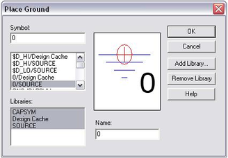 ) (рис.3). Можно также в главном меню “кликнуть” опцию Place, в выпадающем меню “кликнуть” Ground… - появится окно Place Ground. В нём выделить строку 0/Source и нажать кнопку Ok.