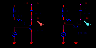На рис.14. приведен пример двух схем моделирования частотных характеристик резонансных усилителей с биполярными транзисторами, включенными по схеме с общим эмиттером и общей базой
