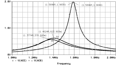 В этих схемах источниками сигналов являются генераторы тока, постоянные и переменные составляющие которых подобраны так, чтобы при напряжении питания Vdd=+5 В токи коллекторов транзисторов были примерно равны. Характеристическое сопротивление контура равно 100 Ом, добротность - 20, эквивалентное сопротивление - 2 кОм, резонансная частота – 1.59155 МГц. Результаты моделирования частотных характеристик резонансных усилителей рис.16 при двух значениях напряжения источника питания:+5 В и +3 В приведены на рис.15. Полученные результаты хорошо согласуются с классическими положениями учебников радиотехники.