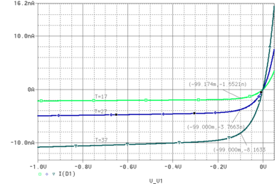На рис.9 приведен пример схем моделирования характеристик диодов: а – с источником напряжения, б – с источником тока. Для схемы рис.9,а проведено сканирование по напряжению источника V1 с параметрами: START VALUE = -1V, END VALUE = 0.05V, INCREMENT = 1mV. При трех значениях температуры: 17, 27 и 37 градусов Цельсия. Результаты моделирования приведены на рис.10.