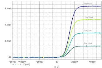 На рис.13 приведены результаты моделирования для схемы рис.12 в диапазоне напряжений V1 от -0.5 В до +0.5 В при четырех значениях параметра (тока базы транзистора). Отрицательные напряжения соответствуют инверсному, а положительные нормальному режиму работы n-p-n транзистора. В рабочей области напряжений ток коллектора пропорционален току базы и мало зависит от напряжения В области насыщения сопротивление насыщения уменьшается с увеличением тока базы.