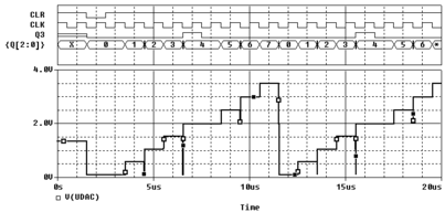 В этом примере только один аналоговый сигнал UDAC, остальные сигналы: CLR, CLK, Q[2:0], Q3 - цифровые. Триггеры счетчика переключаются по спаду сигнала синхронизации. Короткие отрицательные выбросы напряжения UDAC появляются, когда переключаются несколько триггеров и вызваны их последовательным переключением в асинхронном счетчике. Состояние счетчика ACB3 Q= 3+1 повторяется дважды из-за запрета переключения счетчика сигналом NQ3 дополнительного JK-триггера.
