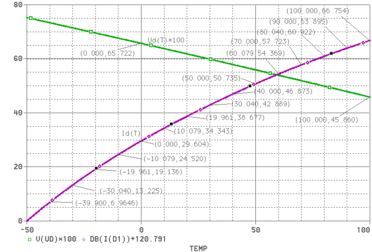 Рис.11. Пример зависимости от температуры напряжения при постоянном токе 1мА (Id*100) и тока диода D1N4148 ( в dB) при постоянном напряжении 0.5 В