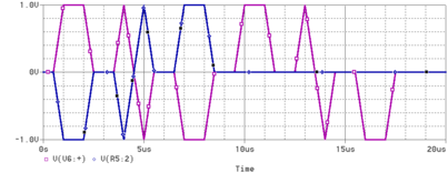 На рис.18 приведены импульсы напряжения генератора VPWL и напряжения на резисторе нагрузки (1к) генератора тока IPWL с параметрами из таблицы 3.