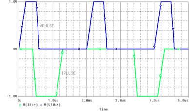 Рис.17. Пример результатов моделирования импульсов генераторов VPULSE и IPULSE с параметрами из таблиц 1,2
