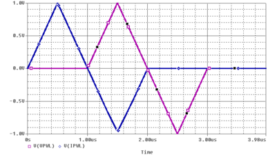 Импульс генератора напряжения VPWL состоит их четырех отрезков (5 точек), а импульс генератора тока из трех отрезков (4 точки).