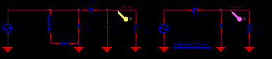 На рис.28 приведен пример схемы моделирования последовательного диодного детектора, подключенного к LC колебательному контуру (L1, C1). Сопротивление резистора R1 имитирует потери колебательного контура. Колебательный контур подключен к источнику синусоидального тока с частотой, равной резонансной частоте контура. Для сопротивления нагрузки детектора R2 введен глобальный параметр {Rd}.