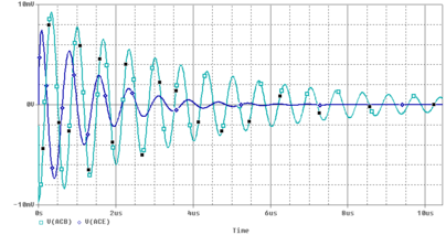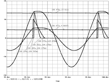 Процесс установления колебаний в схеме рис.30,а достаточно длительный, поэтому для подробного отображения результатов моделирования на небольшом интервале 1 мкс в задании на моделирование установлены: Run Time = 100us, Start saving data after = 99us, а Maximum step size = 0.2ns.