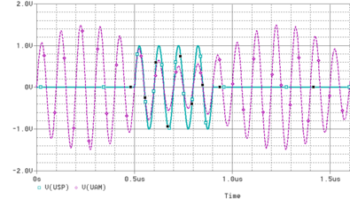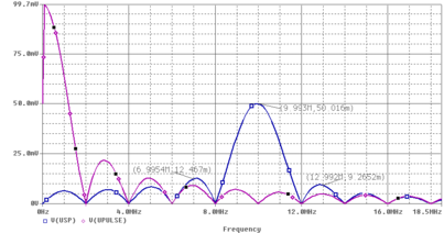 Для получения качественной (гладкой) функции спектра время моделирования должно быть много больше длительности сигнала. В данном примере длительность сигналов равна 0.5 мкс, а время моделирования – 10 мкс.