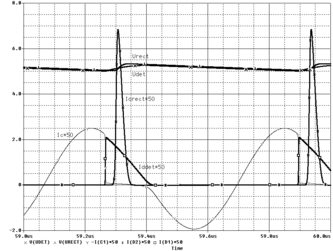 Моделирование схемы диодного выпрямителя рис.30,б проведено для глобального параметра Rd = 1k. Амплитуда напряжения синусоидального источника VSIN подобрана так, чтобы среднее напряжение на выходе выпрямителя было равно среднему напряжению на выходе детектора. Импульсы тока диода выпрямителя имеют и в этом случае имеют характерную треугольную (рис.30), а не “косинусоидальную” форму, но существенно меньшую длительность и большую амплитуду, чем импульсы тока диода детектора.