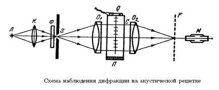 В работе используются: оптическая скамья, осветитель, два длиннофокусных объектива, кювета с жидкостью, кварцевый излучатель с микрометрическим винтом, генератор ультразвуковой частоты, линза, вертикальная нить на рейтере, микроскоп.