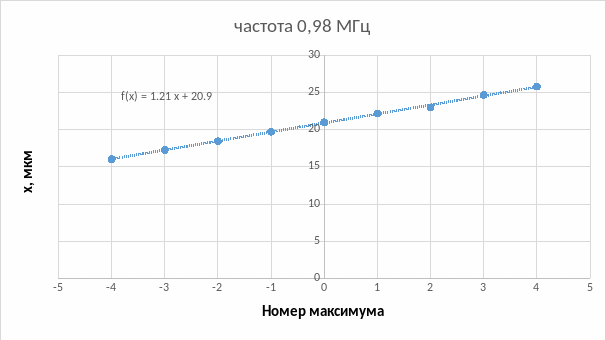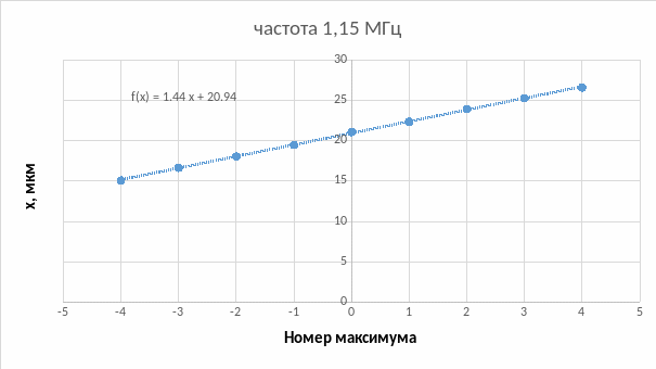 Показания генератора 1,22 МГц, частотометра 1,15 МГц. Расстояние между двумя максимума вида дифракционной картины = 600±10*10-6м.