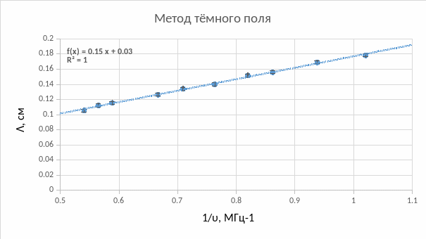 По формуле v=λν (*) получается оценить скорость ультразвука в воде, как 1500±100 м/с. Что хорошо совпадает с ожидаемой теоретически величиной.
