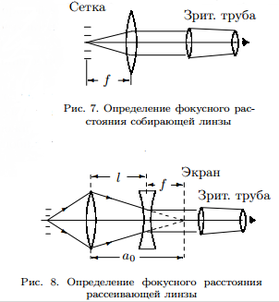 Оборудование: оптическая скамья, набор линз, экран, осветитель со шкалой, зрительная труба, диафрагма, линейка.