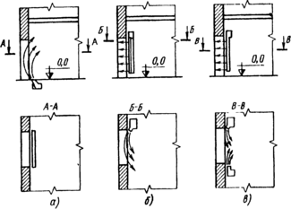 Аэрацией называется организованная естественная общеобменная вентиляция помещений в результате поступления и удаления воздуха через открывающиеся фрамуги окон и фонарей. Воздухообмен в помещении регулируют различной степенью открывания фрамуг (в зависимости от температуры наружного воздуха, скорости и направления ветра). Как способ вентиляции аэрация нашла широкое применение в промышленных зданиях, характеризующихся технологическими процессами с большими тепловыделениями (прокатных цехах, литейных, кузнечных). Поступление наружного воздуха в цех в холодный период года организуют так, чтобы холодный воздух не попадал в рабочую зону. Для этого наружный воздух подают в помещение через проемы, расположенные не ниже 4,5 м от пола (рис. 1.8), в теплый период года приток наружного воздуха ориентируют через нижний ярус оконных проемов (А = 1,5...2 м).