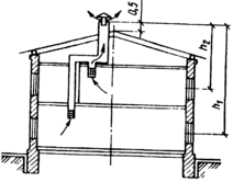 | Рис.1.6. Схема естественной канальной вытяжной вентиляции: h1 –нижний ярус окон; h2 –верхний ярус окон | Рис. 1.7. Принципиальная схема дефлектора ЦАГИ: 7–патрубок; 2–диффузор; 3–кольцо; 4–-зонт |