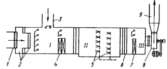 1–заборный воздуховод; 2–фильтр; 3–соединительный воздуховод; 4–калориферы первой и второй ступени подогрева; 5–форсунки воздухоочистки; 6–переходник-каплеуловитель; 7– калориферы второй ступени; 8 – вентилятор; 9 – отводной воздуховод.