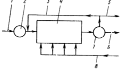 1 – трубопровод подачи исходной сточной воды; 2–первичный отстойник; 3– трубопровод подачи активного ила для повторного использования; 4–аэротенк; 5–трубопровод отвода отработанного ила; 6–трубопровод отвода очищенной сточной воды; 7–вторичный отстойник; 8-–трубопровод подвода сжатого воздуха